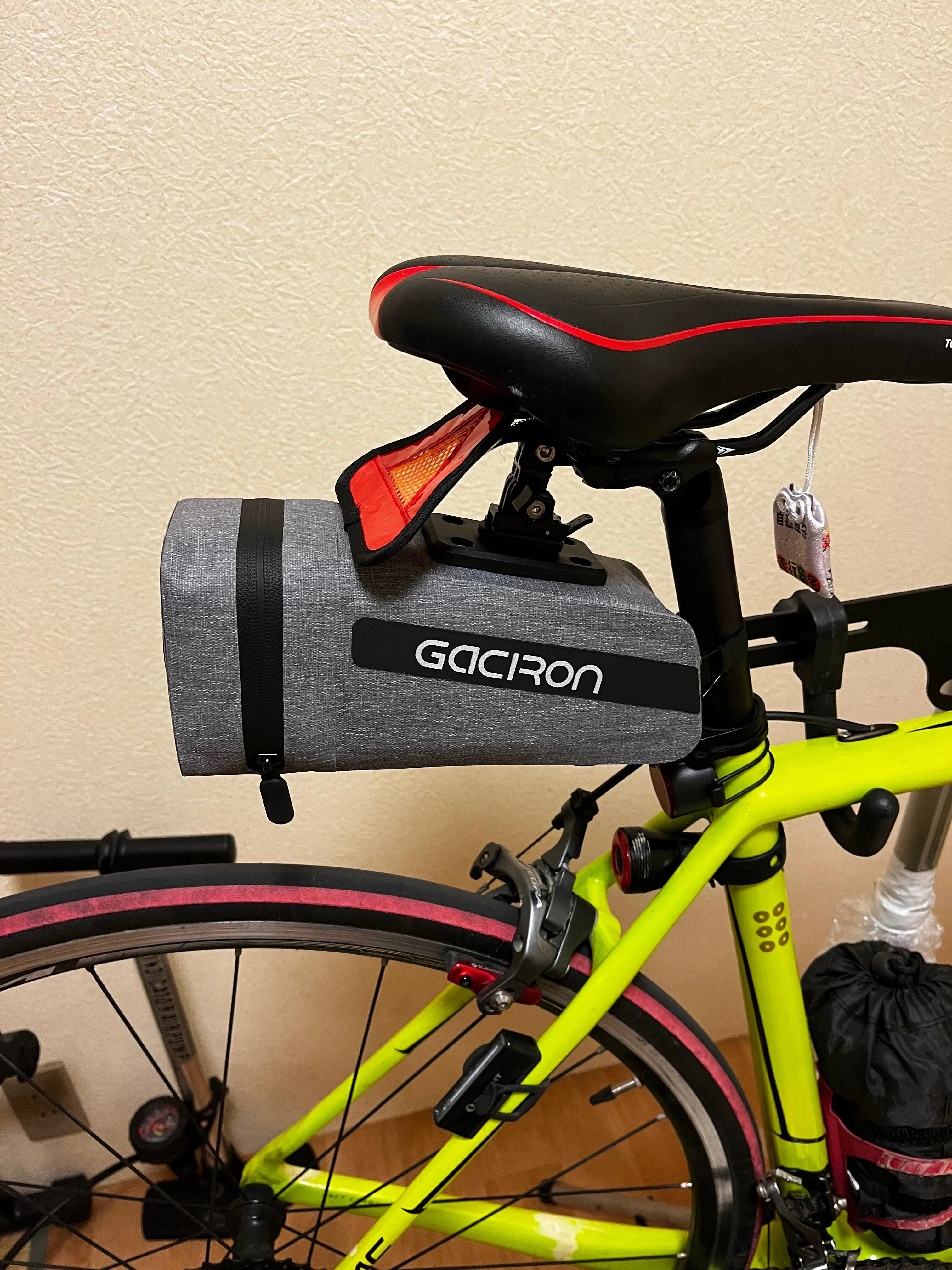 まず、リアライトの問題が解決し、バッグ自体の容量も200キロのロングライドで、簡易工具、スペアチューブ2本、タイヤグラインダー、電動ポンプ、補給食、ワイヤーチェーンロックを入れても十分余裕があります